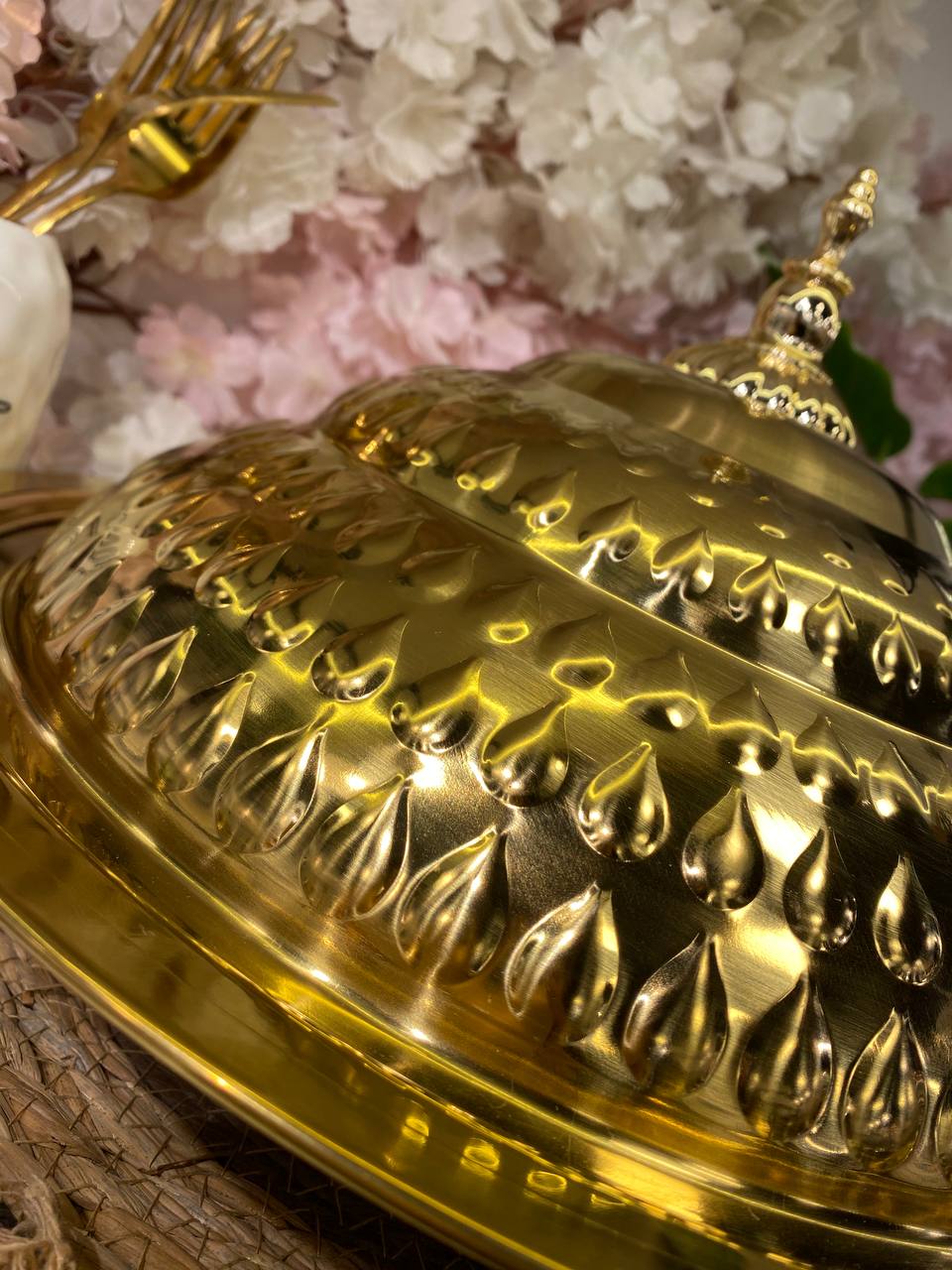 Serving convenience starts with elegant details. A luxurious gold-plated serving tray, sophisticated design.