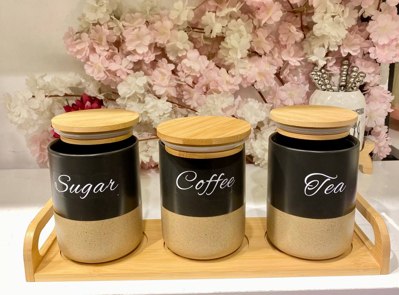 Elevate your kitchen storage with this sophisticated three-piece porcelain set, expertly crafted for both functionality and aesthetic appeal. Each generously-sized round jar features premium porcelain construction, ideal for preserving tea, sugar, and coffee while maintaining freshness. The included wooden stand provides a sturdy, elegant foundation that transforms everyday ingredients into a cu