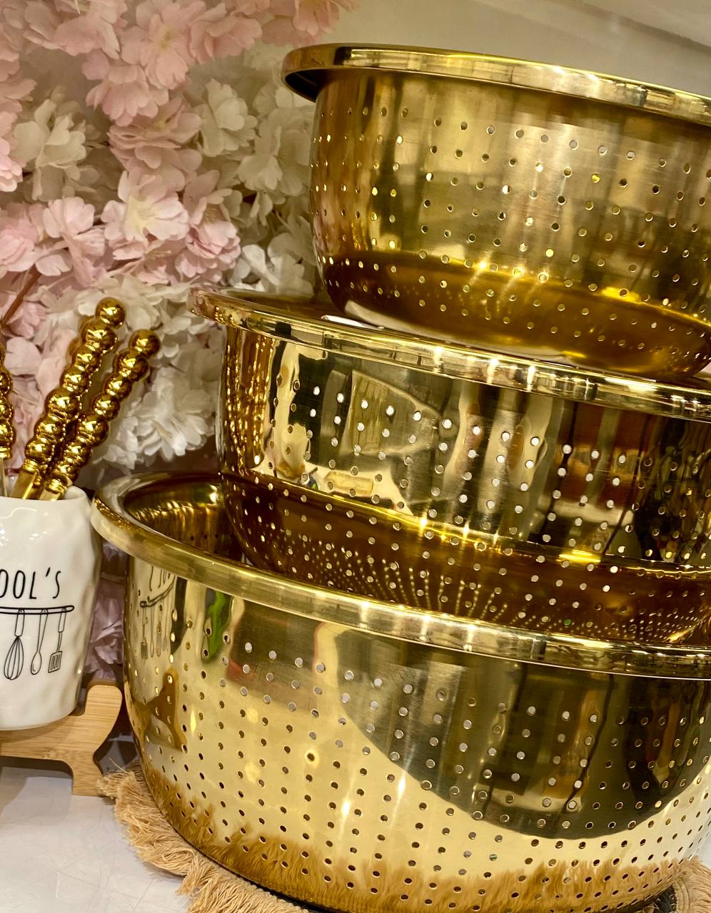 ** Make food preparation easier and more stylish with this gold strainer set made of 100% high-quality stainless