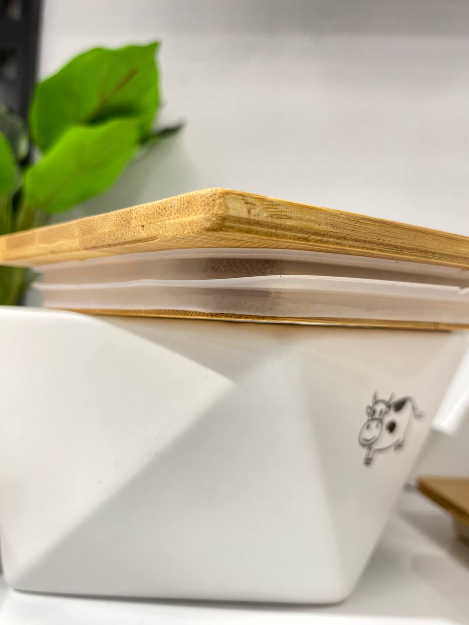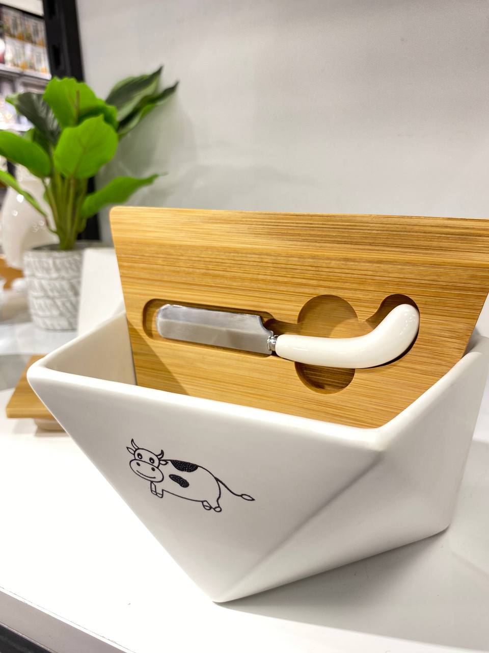 Elevate your kitchen with this hexagonal porcelain butter container, designed for both functionality and style. The airtight seal preserves butter freshness while the charming cow motif adds personality to your countertop. Crafted from substantial, durable porcelain and paired with a refined wooden lid, this piece combines practicality with aesthetic appeal. Includes a dedicated butter spreader for seamless serving. A sophisticated addition for those who appreciate quality kitchenware that doesn